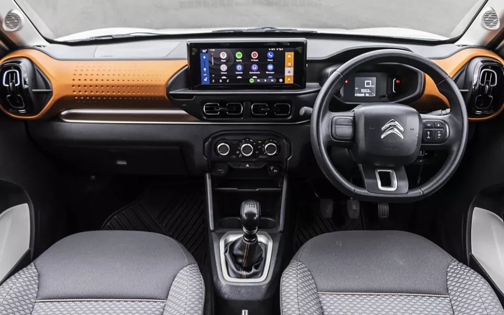 Citroen C3 का इंटीरियर डिज़ाइन सिंपल है, लेकिन प्लास्टिक क्वालिटी को देखकर यह बजट कार नहीं लगती। डैशबोर्ड का टेक्सचर, डोर पैड्स और बॉटल होल्डर की फिनिशिंग काबिल-ए-तारीफ है।