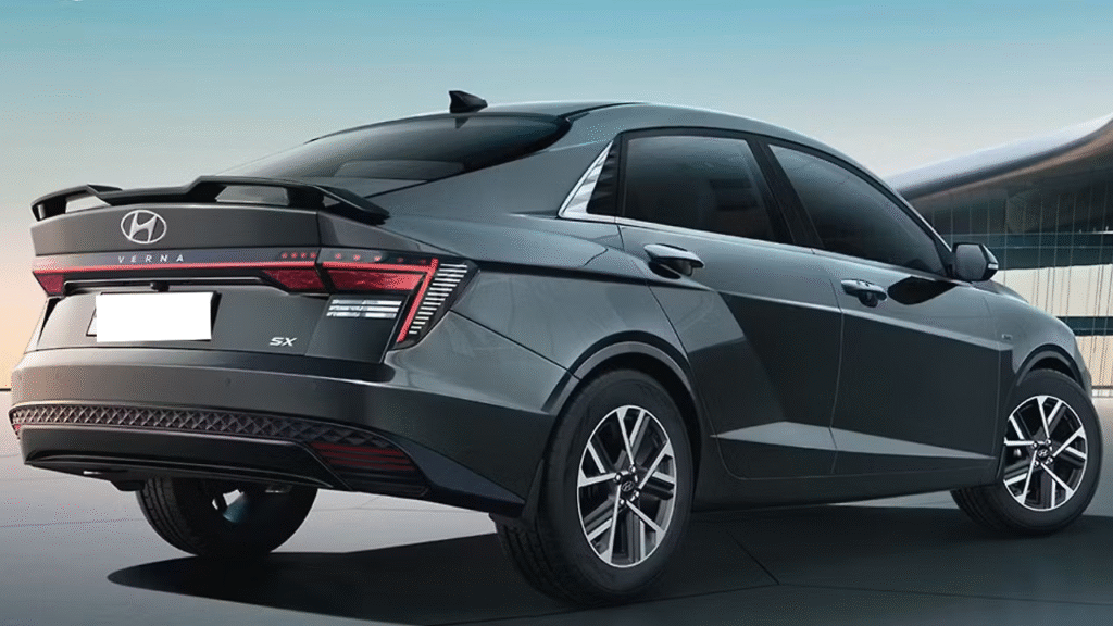 Hyundai Verna के साइड प्रोफाइल में गहरी कटिंग और बढ़ी हुई व्हीलबेस इसे लंबा और प्रीमियम फील देता है। Turbo वेरिएंट में ब्लैक अलॉय व्हील्स और रेड ब्रेक कैलिपर्स स्पोर्टी लुक प्रदान करते हैं। पीछे की तरफ से Hyundai Verna का डिजाइन सबसे ज़्यादा ध्यान आकर्षित करता है। कनेक्टेड टेललाइट्स और क्रिस्टल-लुक वाली लाइट्स इसका हाईलाइट हैं।
