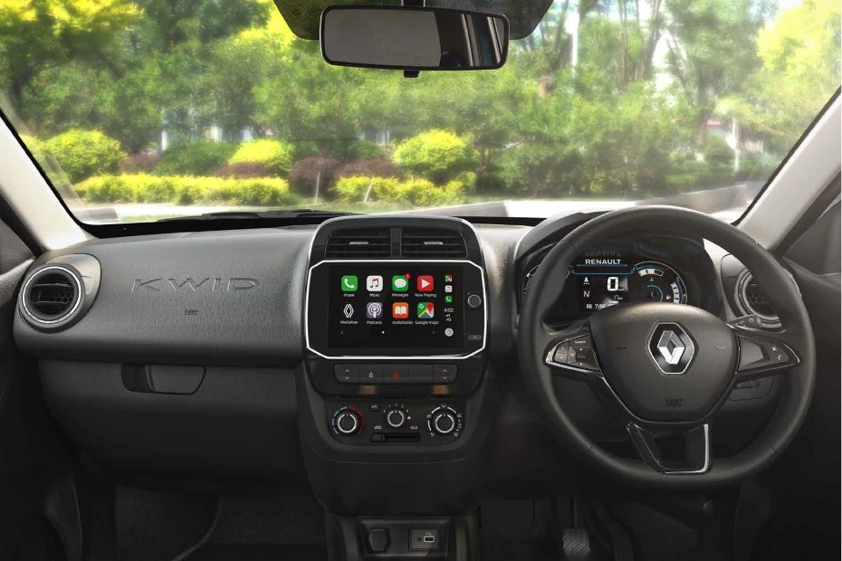 Renault Kwid का इंटीरियर सिंपल लेकिन फंक्शनल है। ब्लैक थीम के साथ सिल्वर इंसर्ट्स और डिजाइनर सीट्स इसे थोड़ा स्टाइलिश बनाते हैं। सीटों की डिजाइन कुछ लोगों को पसंद आ सकती है तो कुछ को नहीं।